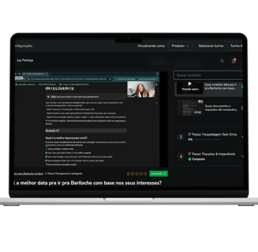 Além de um passo a passo detalhado para planejar sua viagem sem erros, você terá acesso a um treinamento completo em vídeo, com explicações claras e diretas para cada etapa do planejamento.